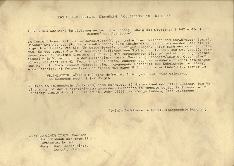 Zum ersten Mal in der Geschichte wird Wöllstein erwähnt unter dem Namen Welthistein mit Datum vom 18.07.855 n.Chr. in einer Urkunde des Lorscher Codex.