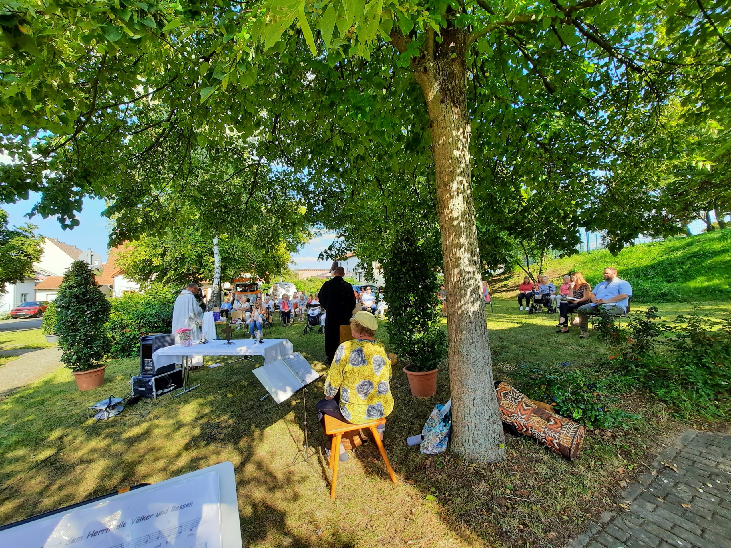 Am Samstagnachmittag fand dann zunächst ein ökumenischer Gottesdienst mit Pfarrer Albert Hantsch und Pfarrer Harald Todisco unter schattenspendenden Bäumen am Gemeindezentrum statt, ehe auch an diesem Tag das bunte Markttreiben viele Gäste anlockte. Zwischenzeitlich so viele, dass eines der 500 Eintrittsbändchen heiß begehrt waren und es zu kurzen Wartezeiten kam.