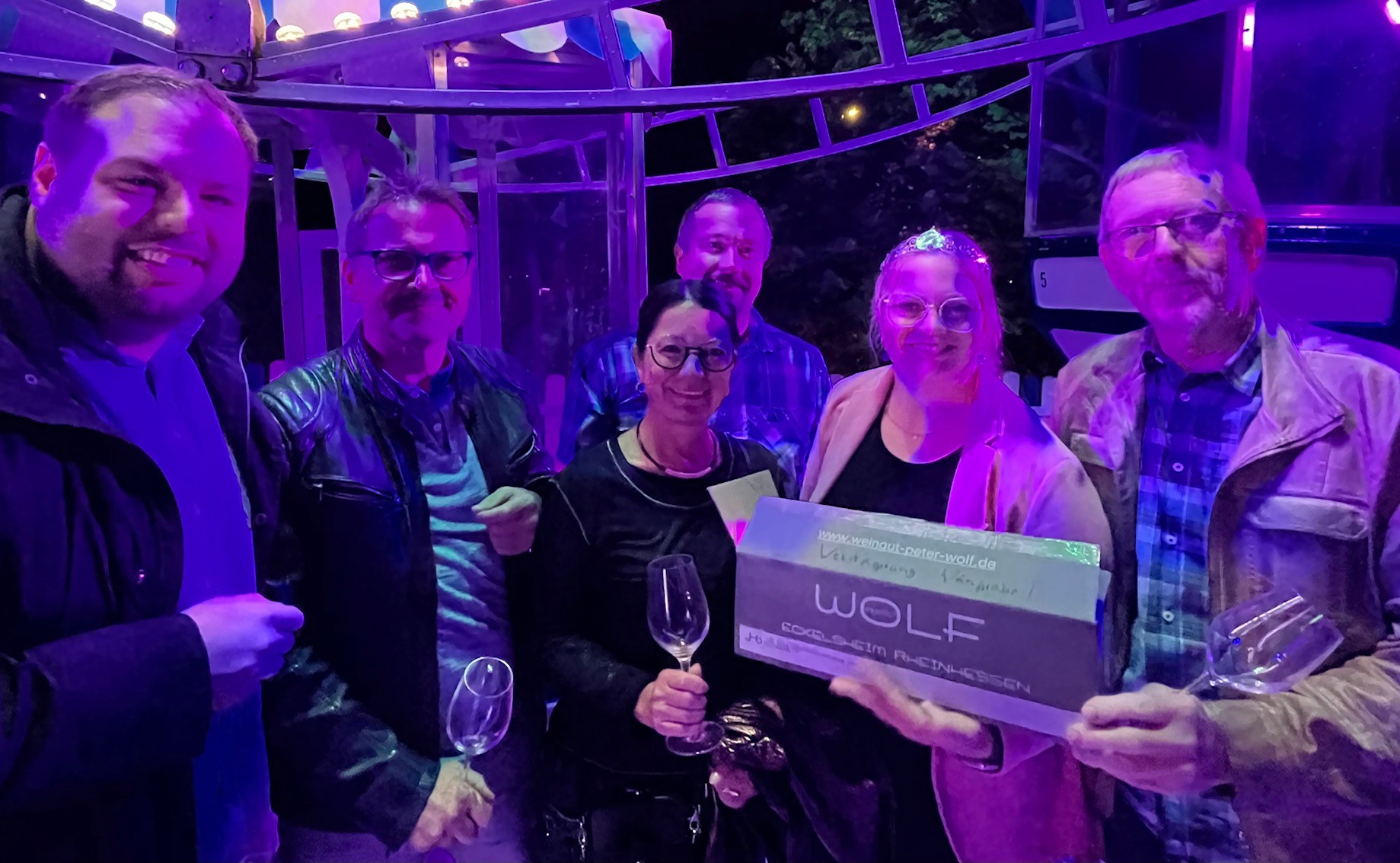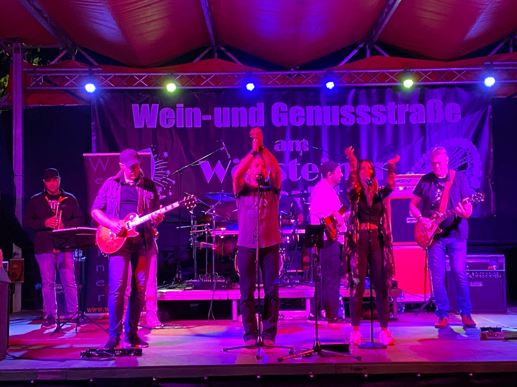Im Anschluss kamen die ersten Sonnenstrahlen heraus und die Besucher strömten schon wieder in die Wein- und Genussstraße und stärkten sich bei Wein, Bier, Likören und Cocktails sowie regionalem Kebab, Backfisch und Fischbrötchen. Eine weitere Neuheit in diesem Jahr war die erstmalige Weinprobe auf dem Riesenrad. Unter fachkundiger Moderation von VG-Weinkönigin Maria I. wurden sieben Weine der Markt-Winzer präsentiert und die Teilnehmer drehten dabei ihre gemütlichen Runden auf dem Riesenrad. Durch die Versteigerung eines Weinpaketes, der großzügigen Weinspenden der Winzer sowie der kostenlosen Bereitstellung des Riesenrades der Schaustellerfamilie Moser konnte eine stolze Summe für die befreundete Gemeinde Antweiler an der Ahr gesammelt werden. Am Abend rockte dann die Band Wet Corner die Bühne und das Publikum feierte noch ausgelassen und fröhlich bis Mitternacht an der großen Bühne am Schloss Stadion.