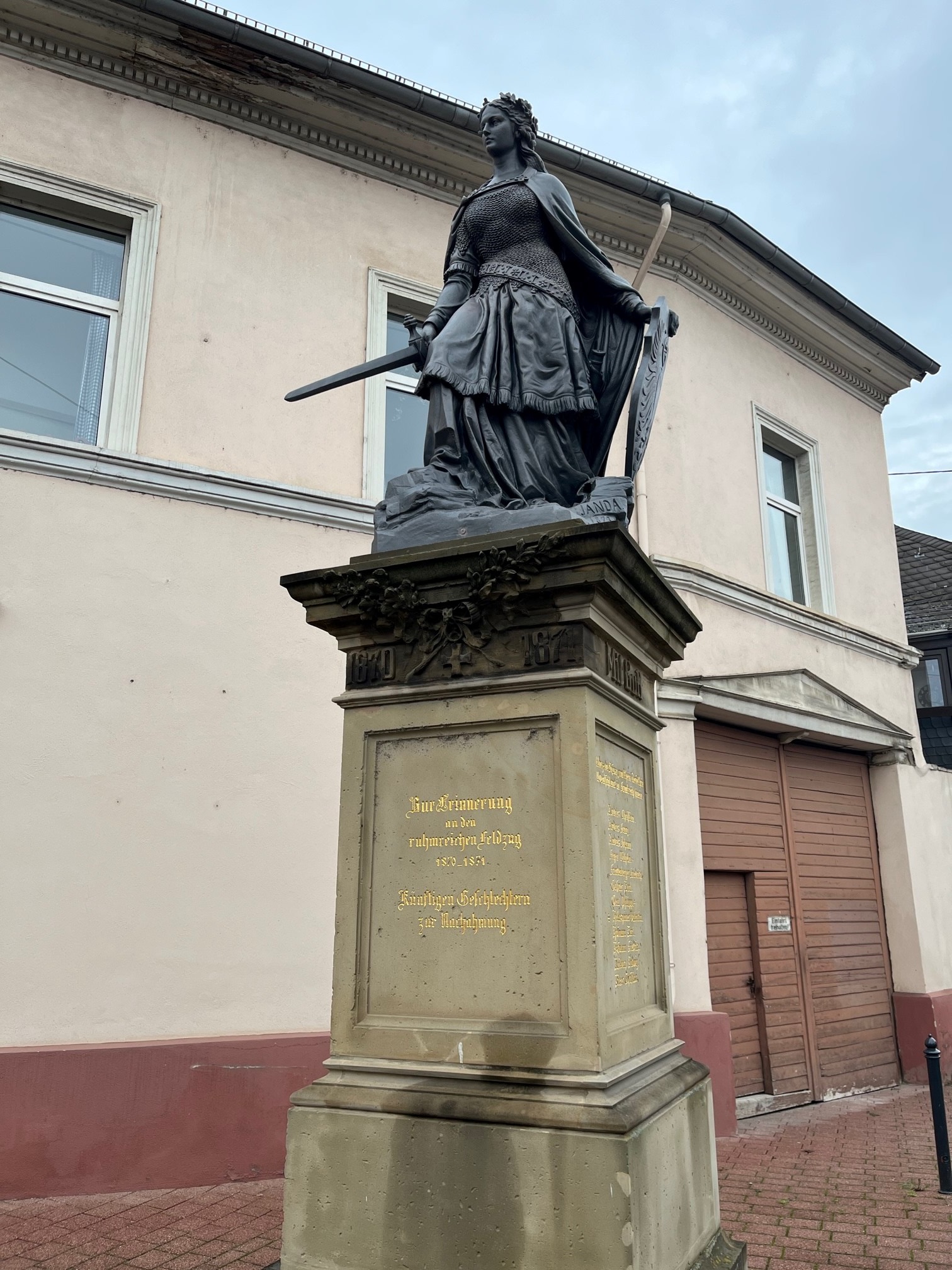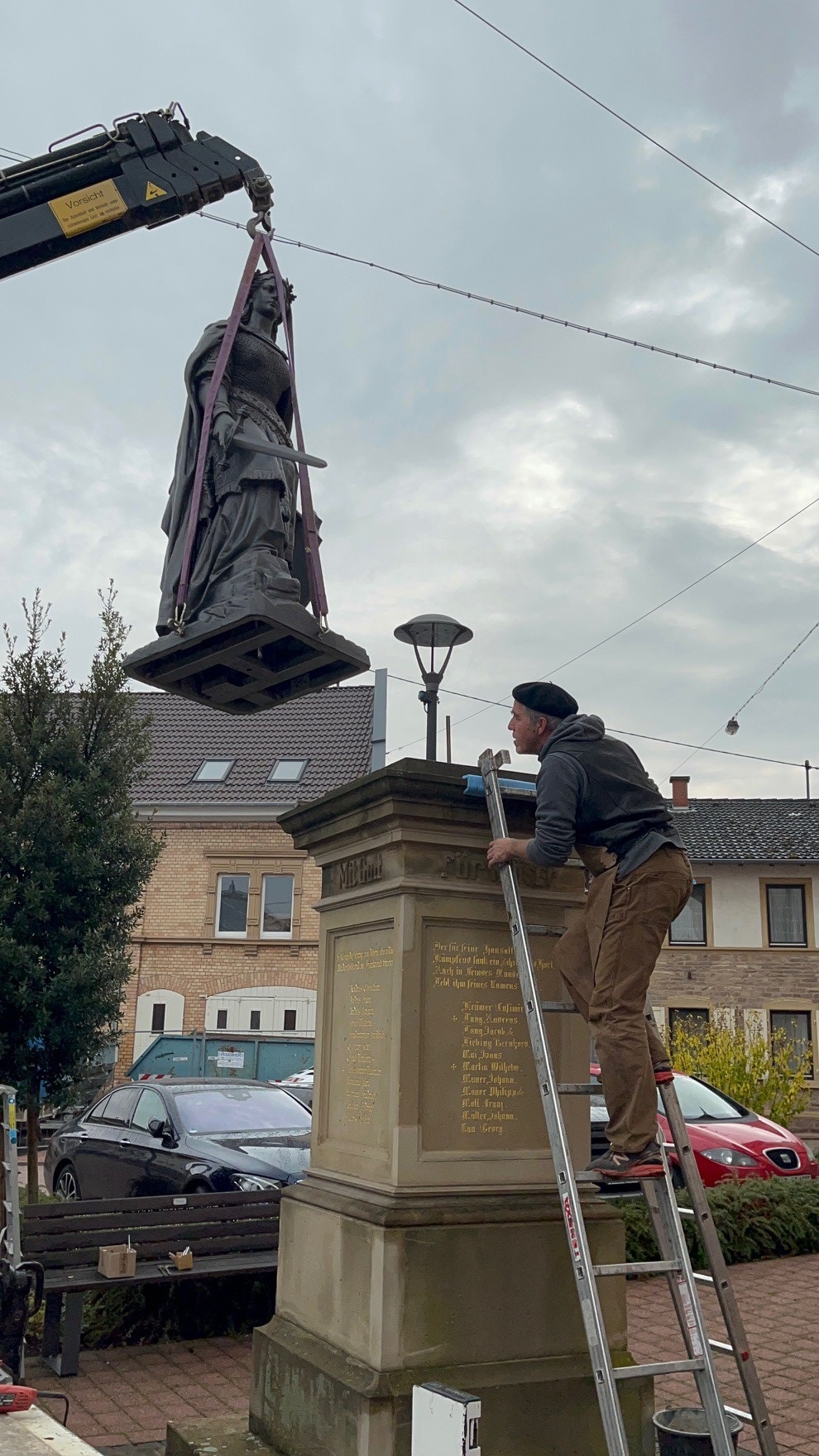 Nach rund dreijähriger Abwesenheit kehrte “unsere“ Germania wieder zurück nach Wöllstein. Da die bereits vorher restaurierte Statue im September 2018 beinahe vom Sockel gestürzt ist, musste die Figur vom Sockel entfernt werden sowie erneut repariert und restauriert werden. Die Figur wurde mit einem aufwendigen innenliegenden Skelett aus Edelstahl versehen, sodass ein erneutes absenken oder gar herabstürzen ausgeschlossen werden kann. Heute wurde die Germania-Statue wieder nach Wöllstein gebracht und fest auf dem Sockel verschraubt, sodass sie hoffentlich ab jetzt lange Zeit wieder am angestammten Platz stehen kann.